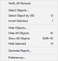 - Verify All Textures: Checks all texture to make sure there are no corrupt bitmaps, that no textures are larger than 256 x 256, and that all textures have dimensions that are a power of 2.