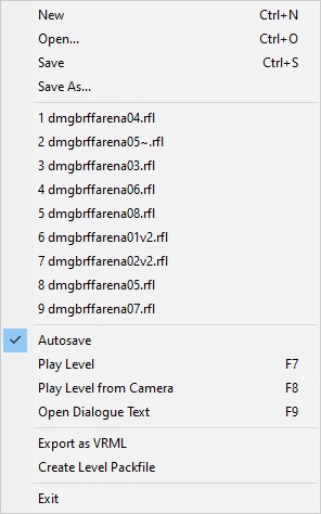 - Export as VRML: Export level in VRML format. Used for importing level geometry into programs like Max, Lightwave, etc.
