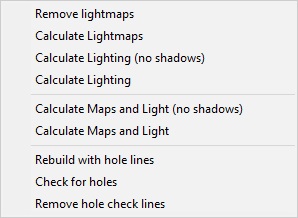 - Calculate Maps and Light (no shadows): Recalculate lightmaps and lighting without shadows for the level.