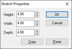 - Copy: This is very handy feature. If you want 2 or more brushes to be the same size, you can use copy and paste to copy one brush's dimensions to another. Simply select the brush you want dimensions from, open the Stretch dialog box, then click Copy. Now select the brush you want to copy the new dimensions to, open the Stretch dialog box for that brush, click on Paste and you're done.