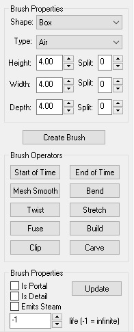 - Properties: This brings up the property dialog box for the currently selected brush(es) or object(s). You cannot see properties for brushes and objects at the same time. You cannot see properties for multiple objects that are not the same type.