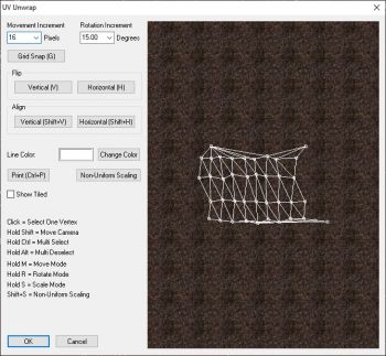 - Print: Takes screen capture (.tga) of UV unwrapper window. Useful for creating custom fitting textures.